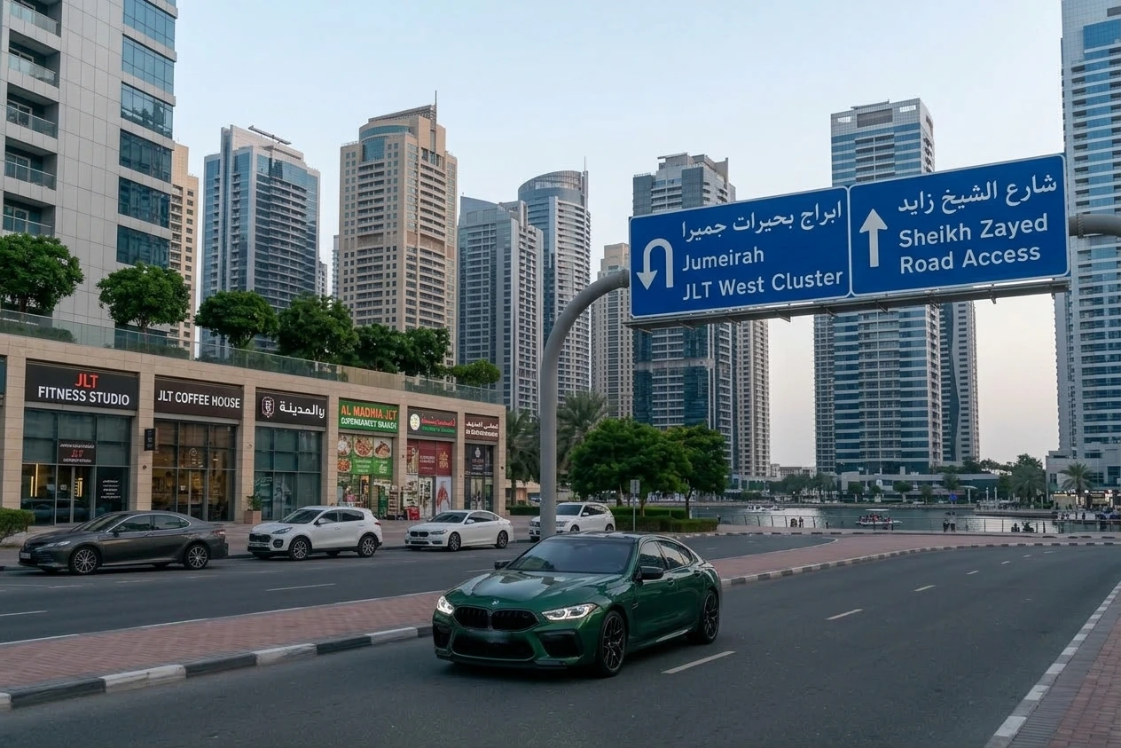 Jumeirah Lake Towers is one of Dubai’s most dynamic mixed-use communities. Positioned directly across Sheikh Zayed Road from Dubai Marina, JLT is built around a cluster of man-made lakes and features an impressive skyline of residential and commercial towers that house a large community of professionals, families, and businesses. It is a neighbourhood that works hard, moves fast, and demands transport that keeps pace – and that is exactly where Headway Rent a Car comes in.